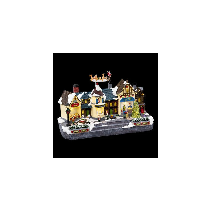 Une fois branché sur le secteur, la rue prendra vie grâce aux nombreuses LED et le traîneau du père Noël fera des allers-retours.